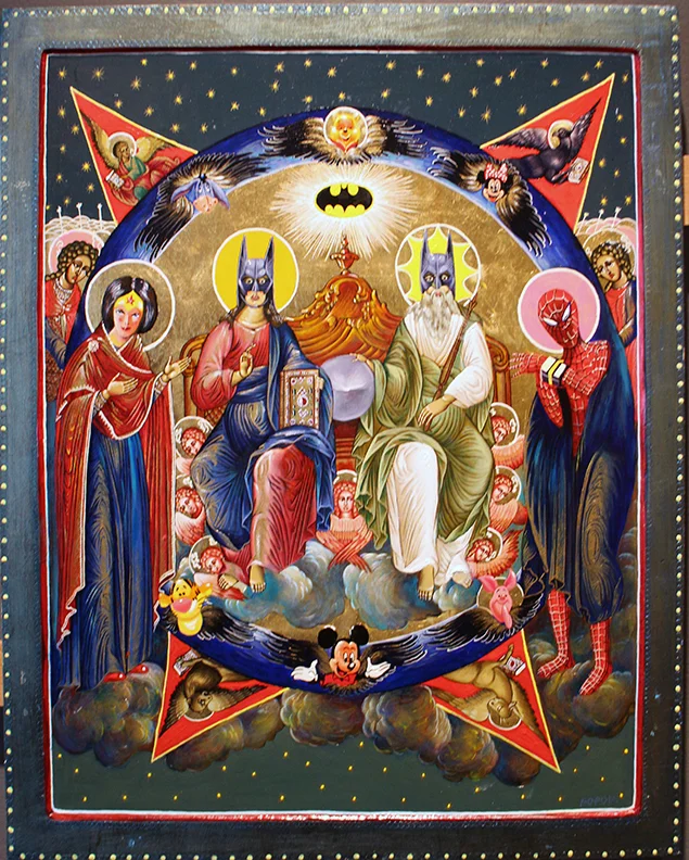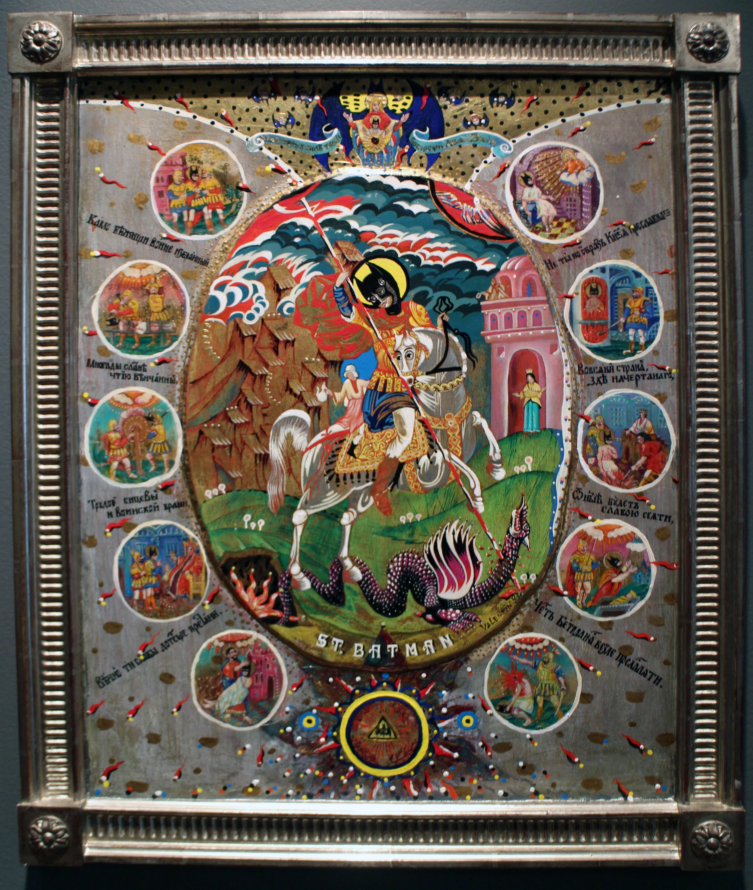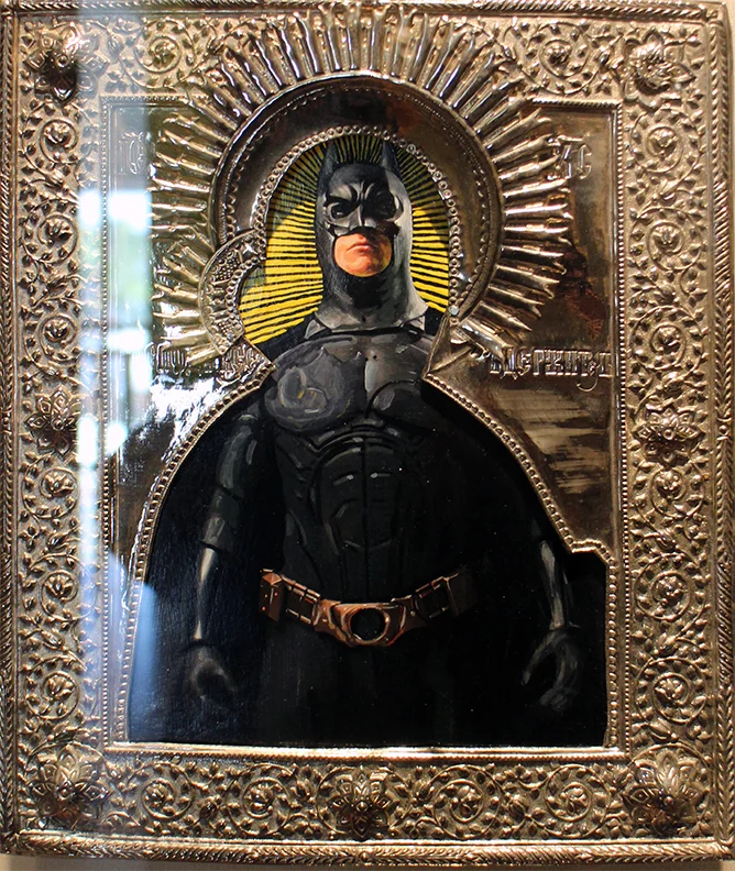 From intricate hand tooled frames appear renaissance imagery with a humorous twist. Replaced traditional portraits and other painting are traded for images of Batman and other contemporary vignettes. The show encompasses the history of Batman, Wonder Woman and other characters in iconic replicas.